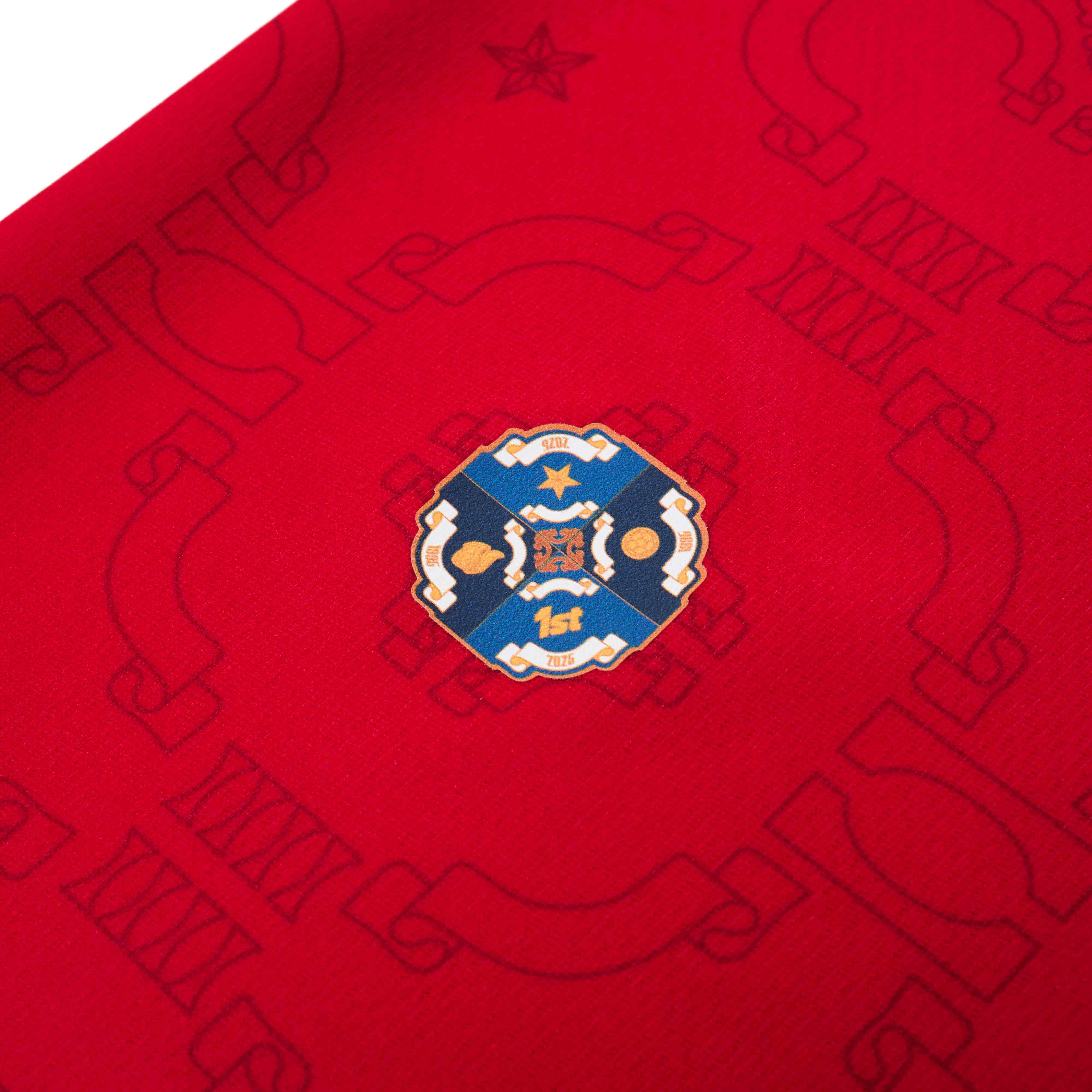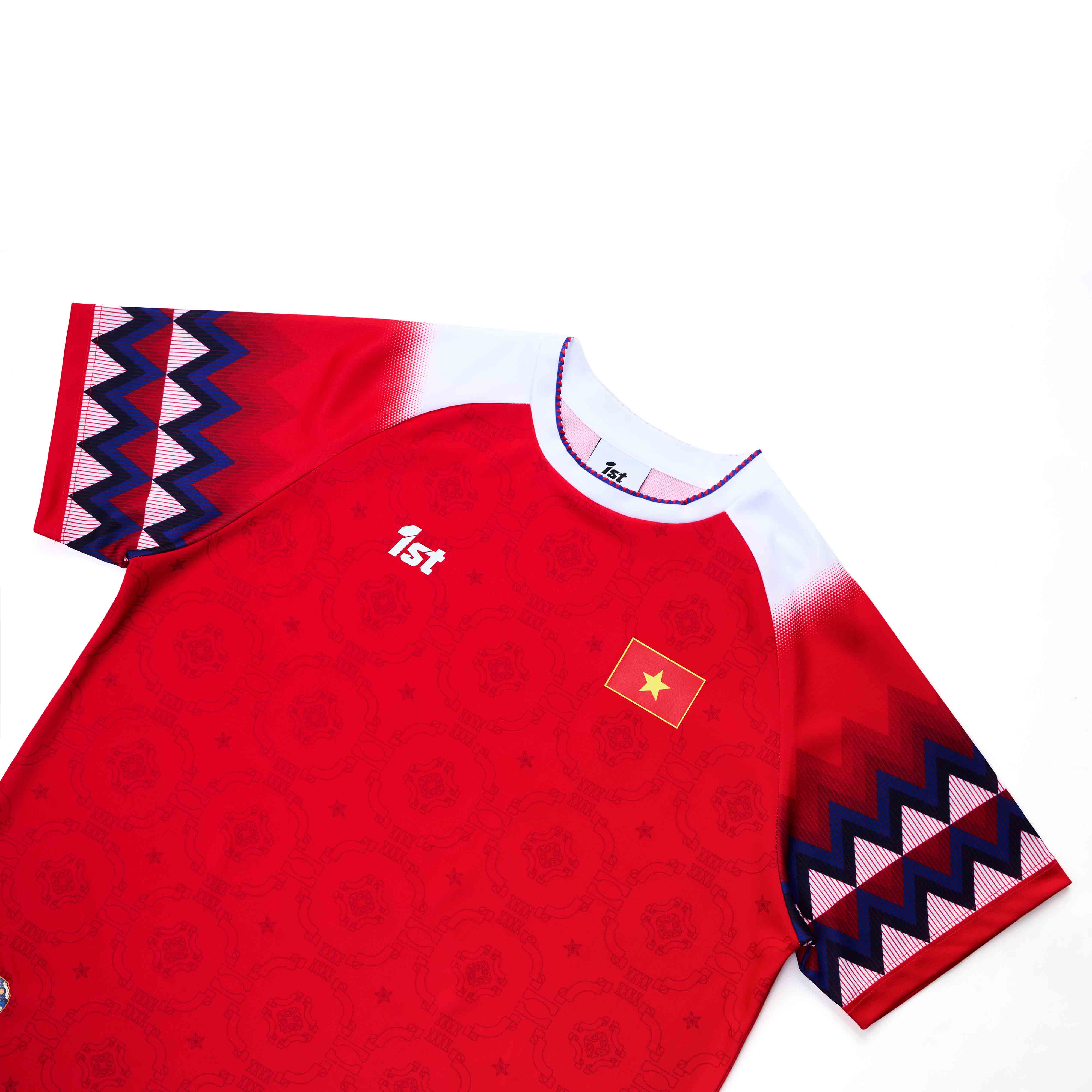 Phía sau cổ áo in thông tin giải đấu như một lời nhắc về thời khắc đáng nhớ, cùng họa tiết gạch bông truyền thống trải đều trên thân áo góp phần tôn vinh bản sắc văn hóa Việt Nam – mộc mạc, mà đầy tinh tế.